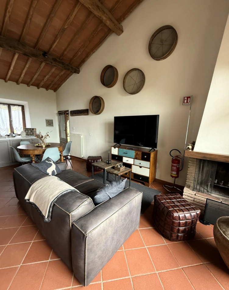Die elegante Suite „Montalcino“ verfügt über fünf Betten, zwei moderne Badezimmer mit Dusche, ein stilvolles Wohnzimmer und eine komplett ausgestattete Küche. Von der privaten Terrasse geniessen Sie einen atemberaubenden Blick auf die malerische toskanische Landschaft und haben direkten Zugang zur Veranda, wo Giovanna das köstliche Frühstück serviert.