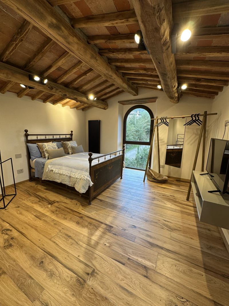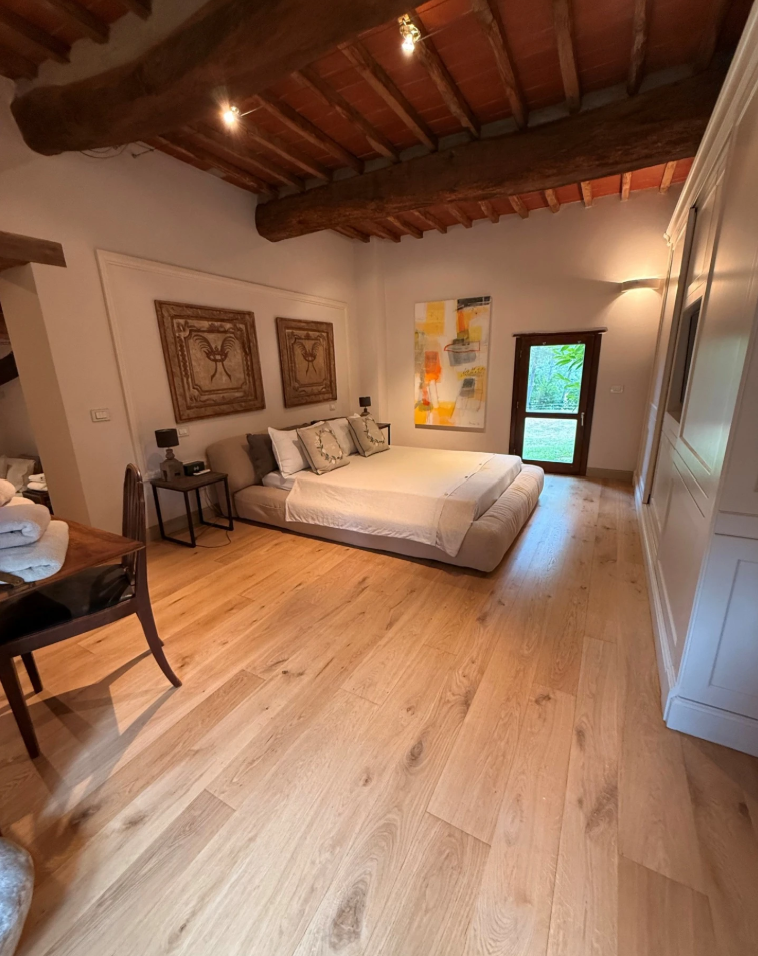 Die gemütliche Mansarde „Capanna“ in einem ehemaligen Heustock bietet ein komfortables Doppelbett und einen charmanten Blick auf die Villa. Das moderne Badezimmer ist mit einer Dusche ausgestattet. Im unteren Stock erwarten Sie eine stylische Bar sowie ein Snooker-Billardtisch – perfekt für entspannte Abende nach einem Tag voller toskanischer Erlebnisse.